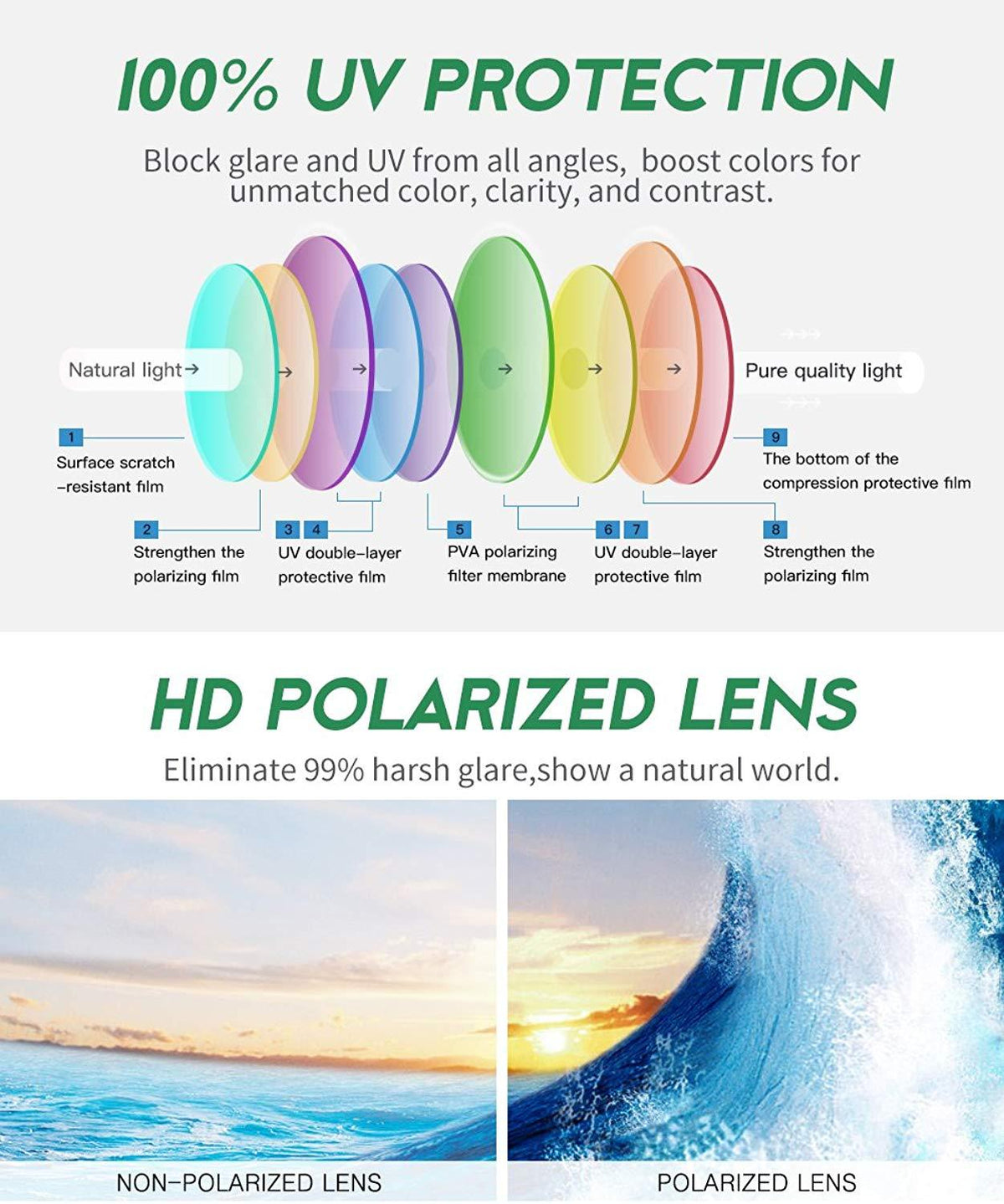 Features: Polarized: Polarized lenses eliminate or reduce glare. Our lenses are specially designed to offer 100% UVA and UVB protection even in intense lighting conditions. Without polarized protection, depth perception is reduced, distorted view and color perception occur, and in some cases, you could be temporarily blinded. Polarization is useful for many outdoor activities including driving, extreme sports, water sports, and fishing. The benefits of polarized sunglasses are endless and can save your vision!