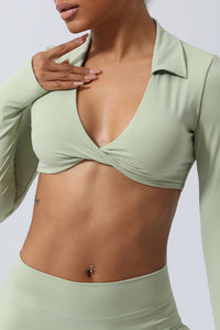 Meadow Mist Green Long Sleeve Collared Twist Neckline Cropped Gym Top
