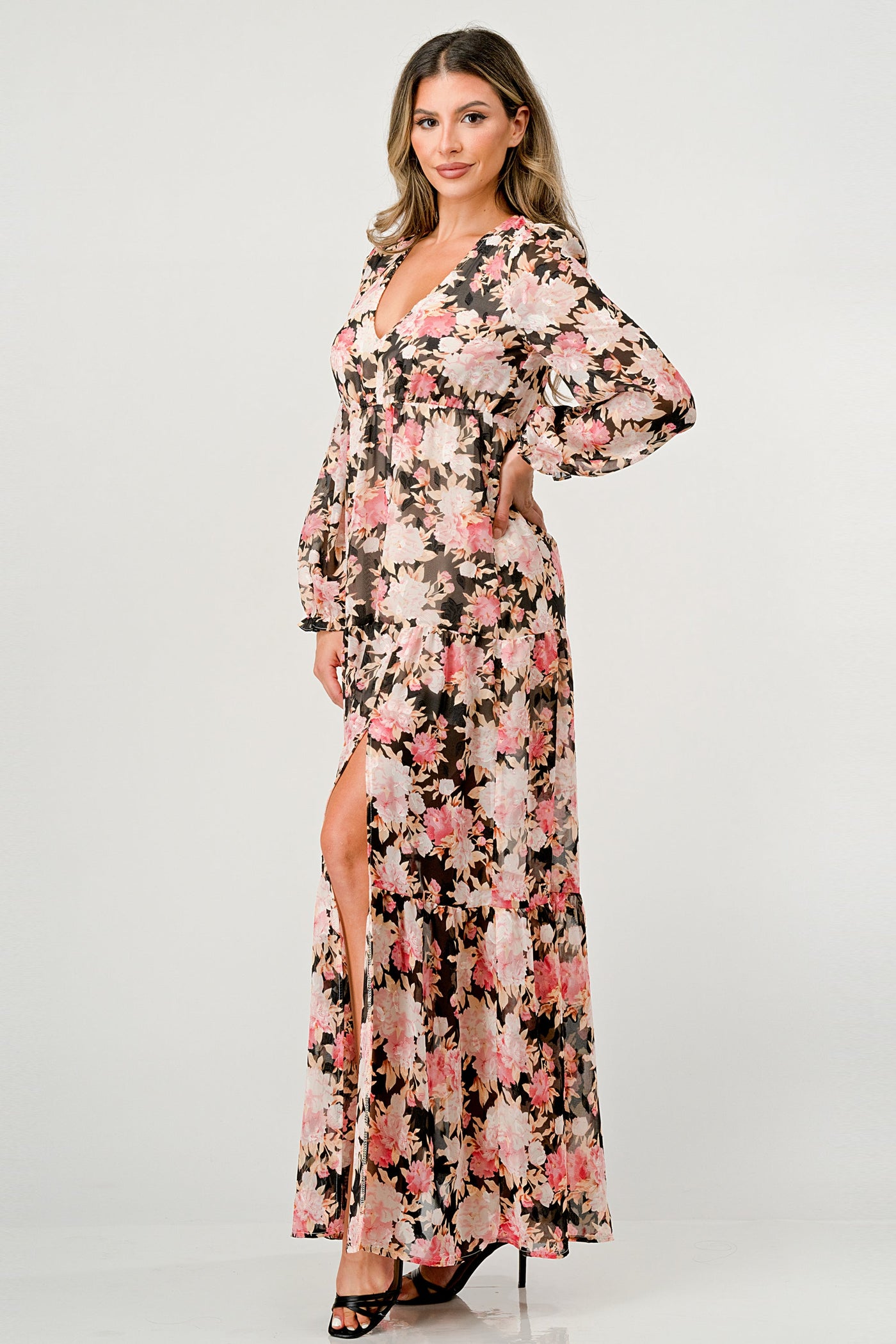 V neck long sleeve slit front tiered maxi dress with floral print chiffon