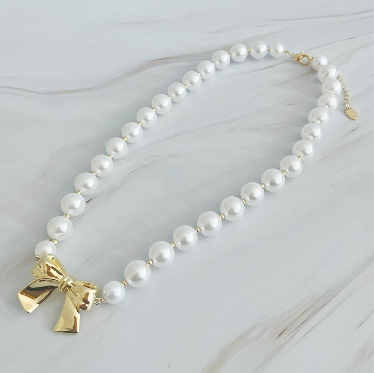 This beautiful pearl necklace features a classic and timeless design, adorned with an intricate bow in the center. Pairing elegance...