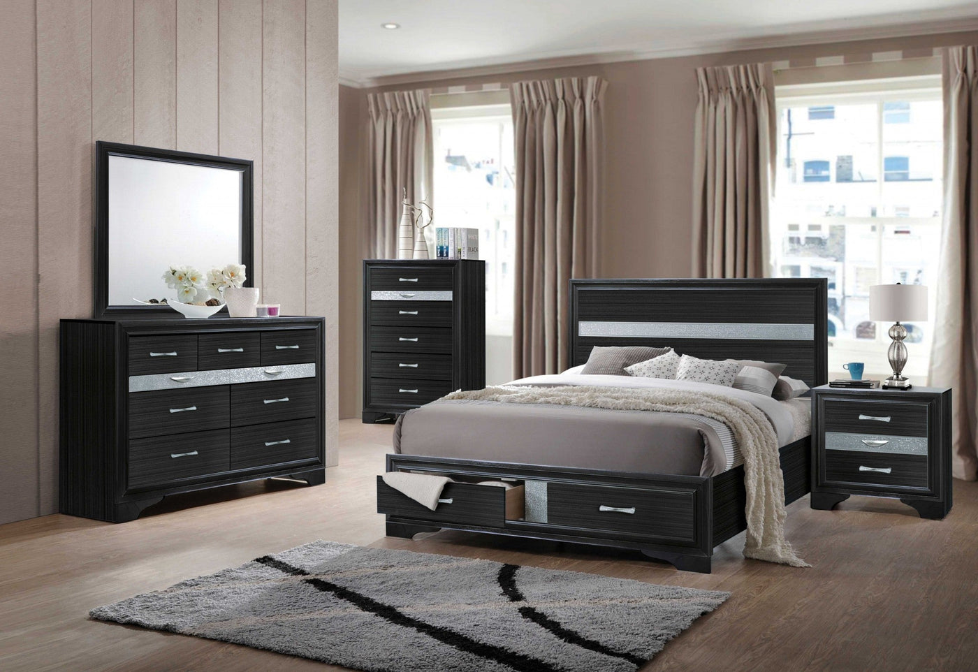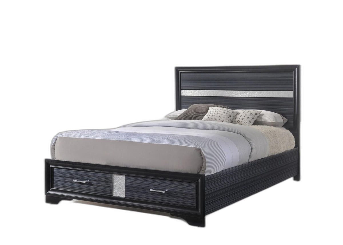 This bedroom collection offers sophisticated look, clean lines and contemporary style. Features panel headboard, and storage footboard in rich black...