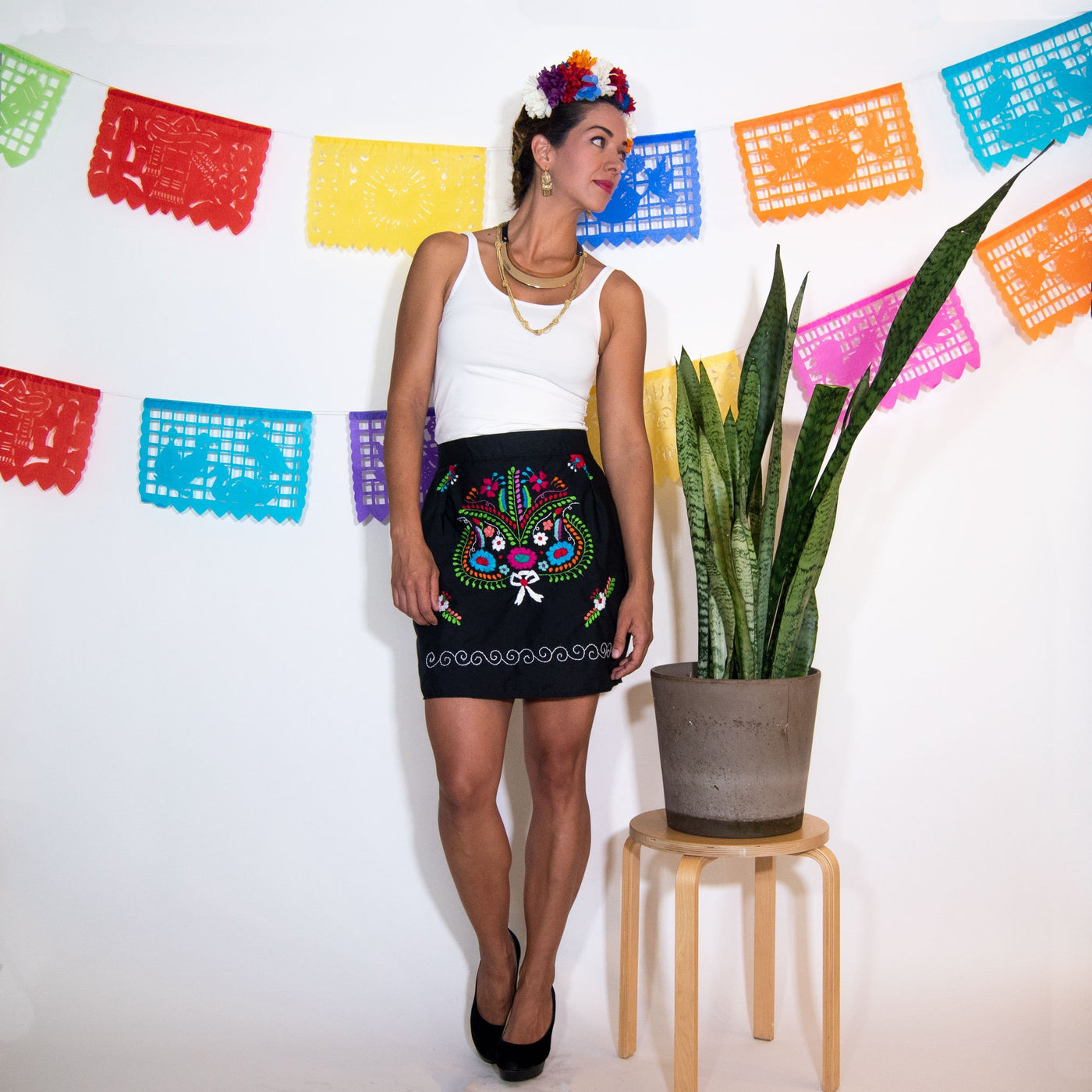 Black and multicolor flower embroidery on front of skirt. Super fashionable, short and loose skirt has an elastic band...