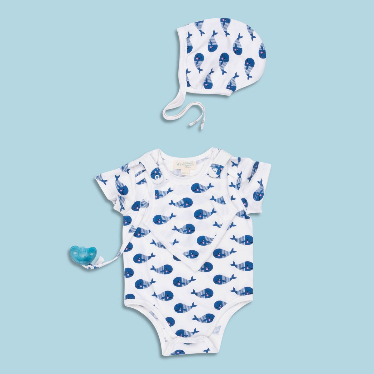 Smart Short Sleeve Baby Bodysuit + Bib - Blue Whale - 12-18 M / Blue Whale