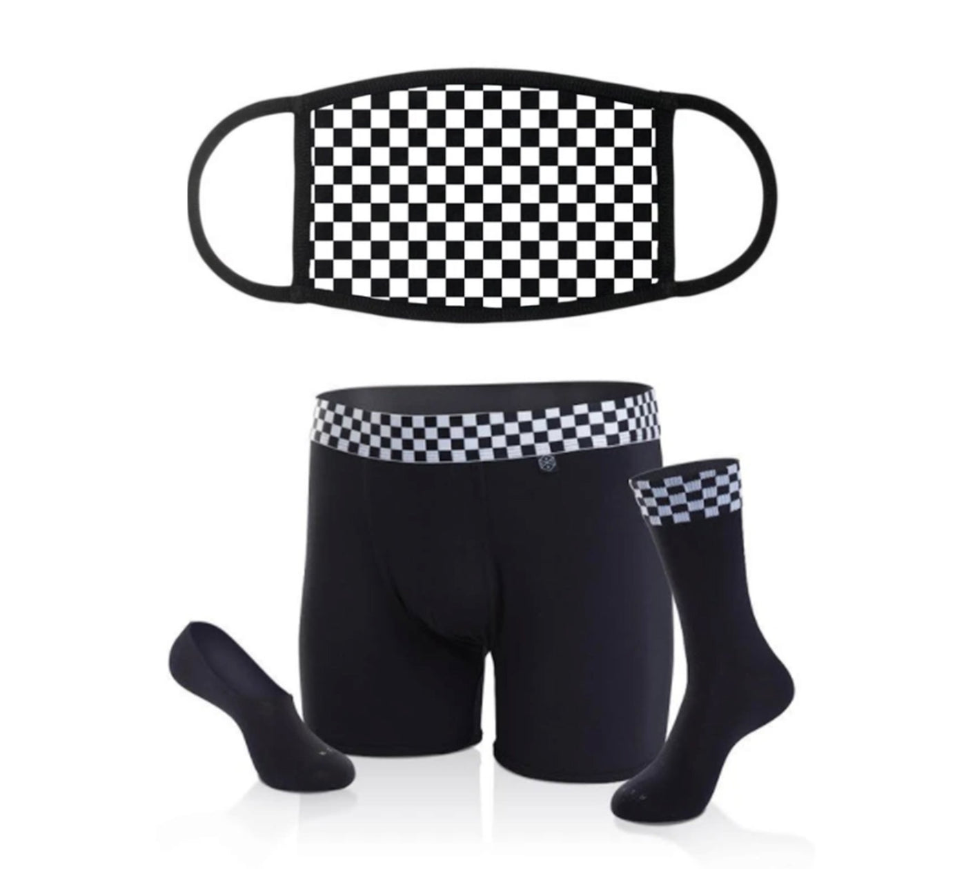 Limited edition black and white checkered face cover to match boxer briefs and socks. One face cover 100% cotton on...