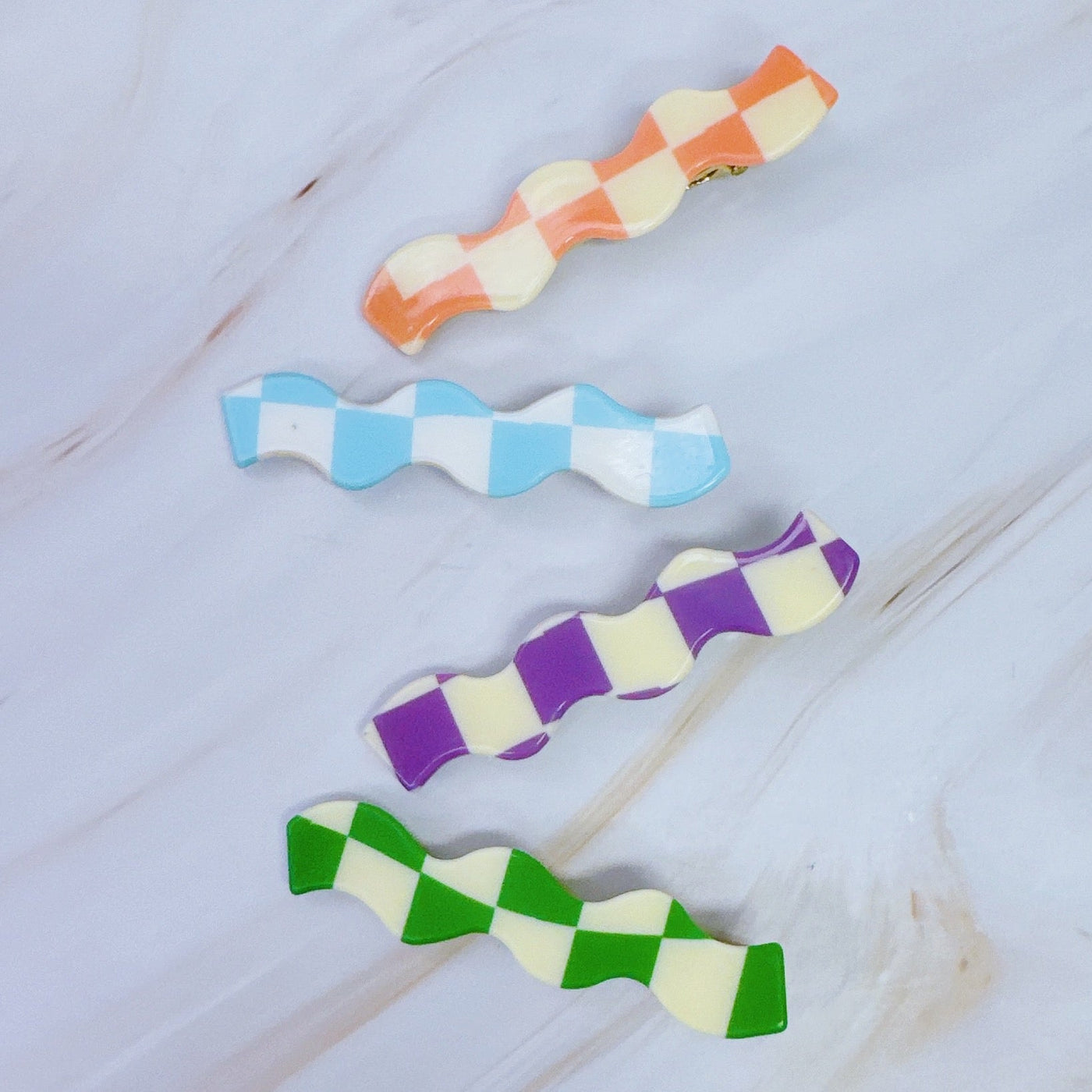 Checkered Wavy Creaseless Hair Clip Set Of 4 - Happy Multi