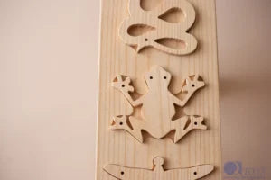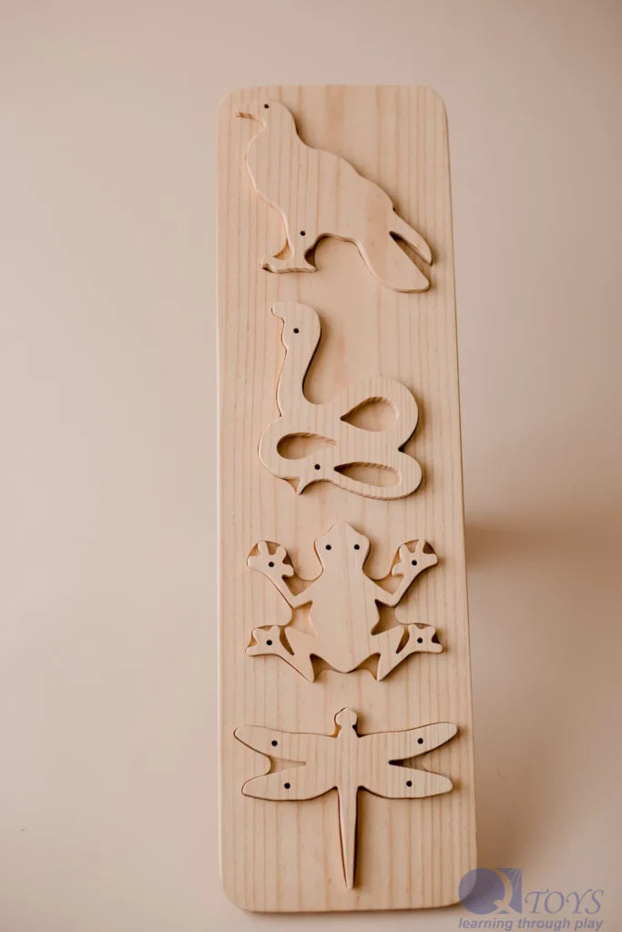 how the food chain works. It includes wooden pieces of an insect, a frog, a snake and