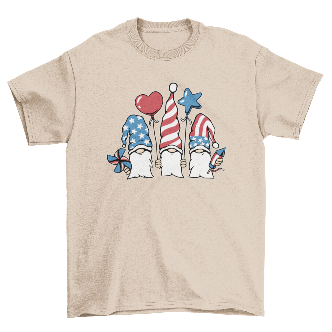 Fun t-shirt design featuring three gnomes with the colors of the american flag.